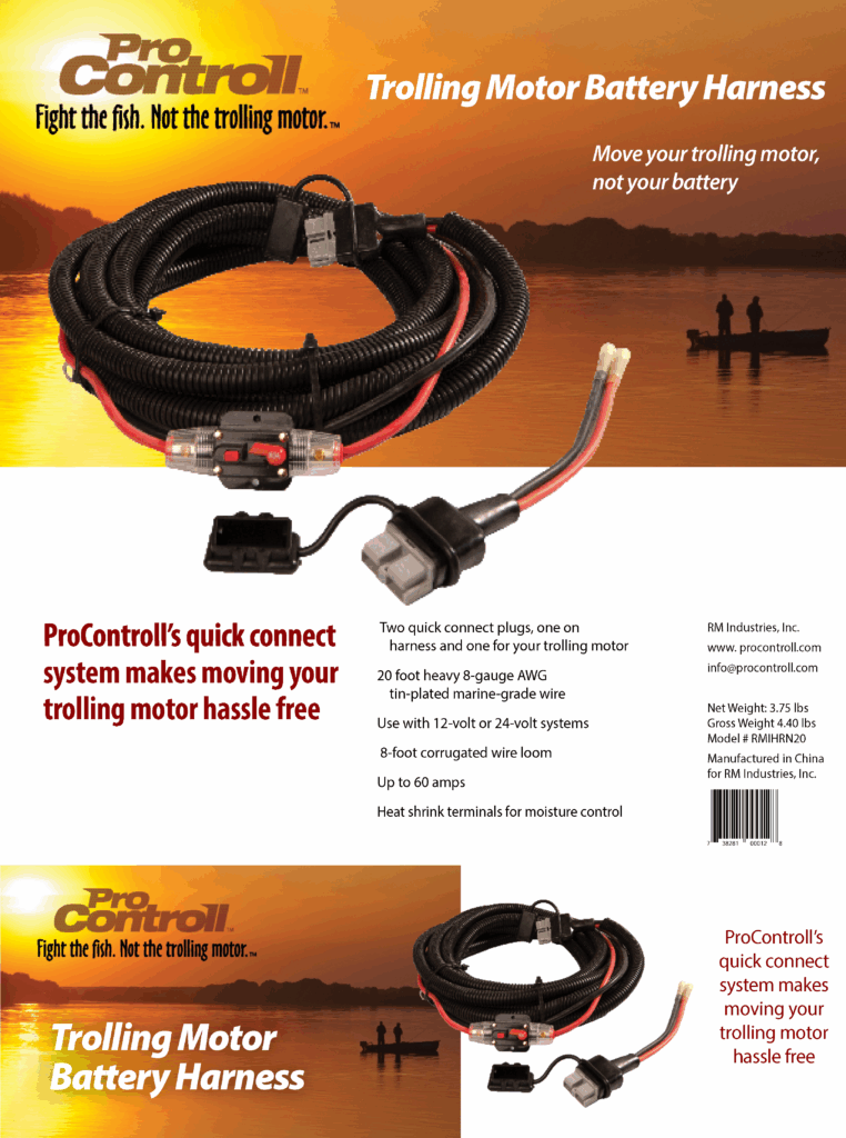 Power your bow-mounted motor cleanly from a stern-mounted battery. The Pro Controll Battery Harness includes 20 feet of pre-loomed 8-AWG tinned copper, sealed terminations, and a resettable 60-amp breaker—everything you need for a tidy, reliable install.